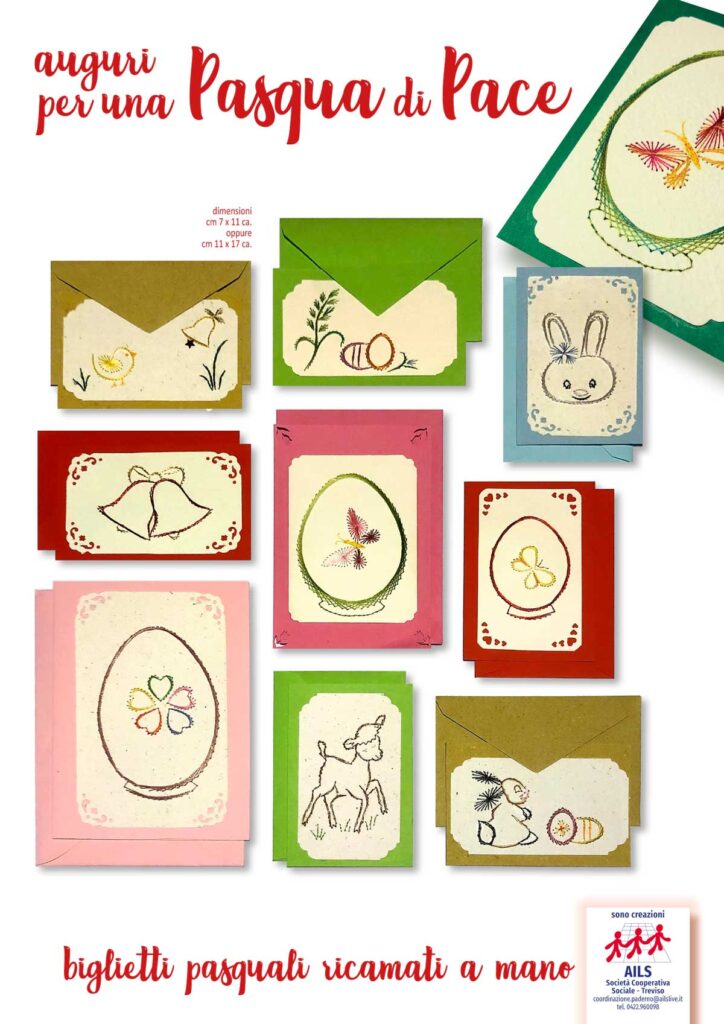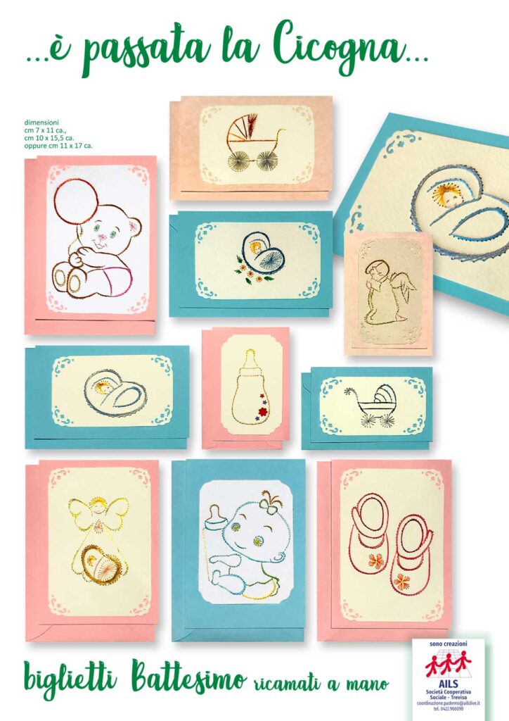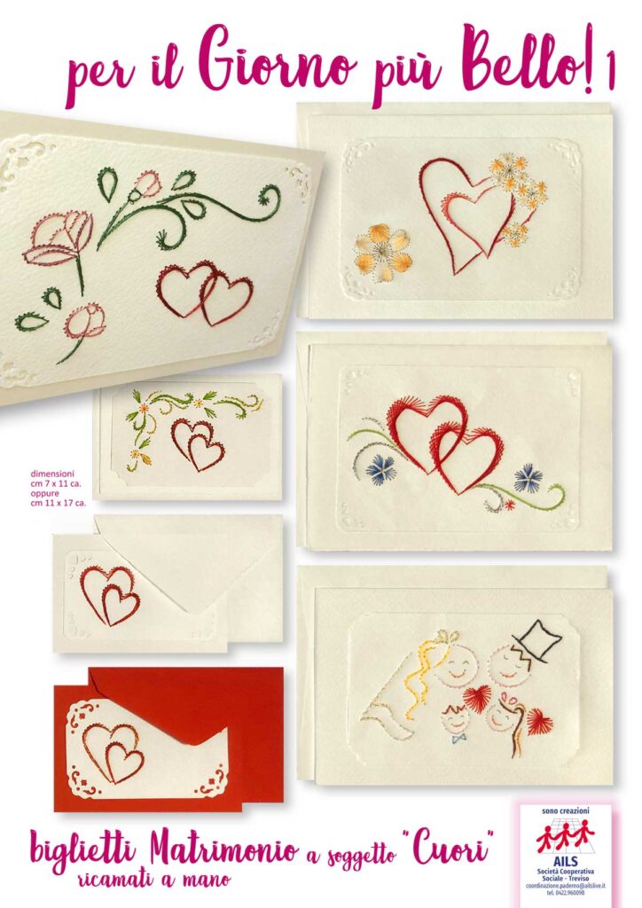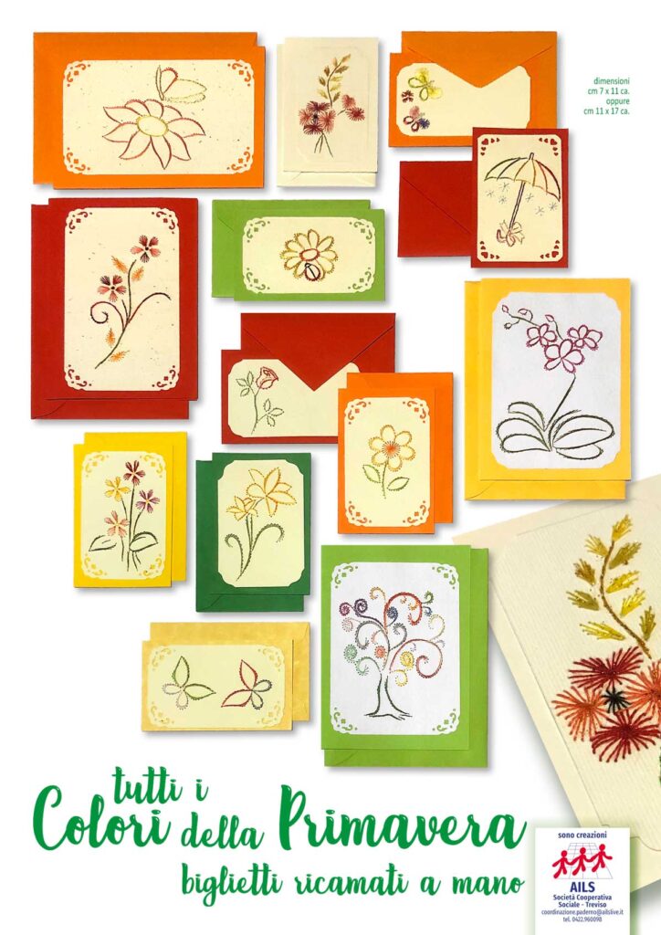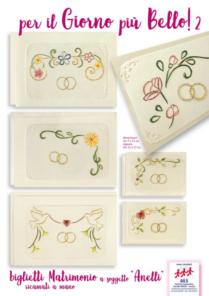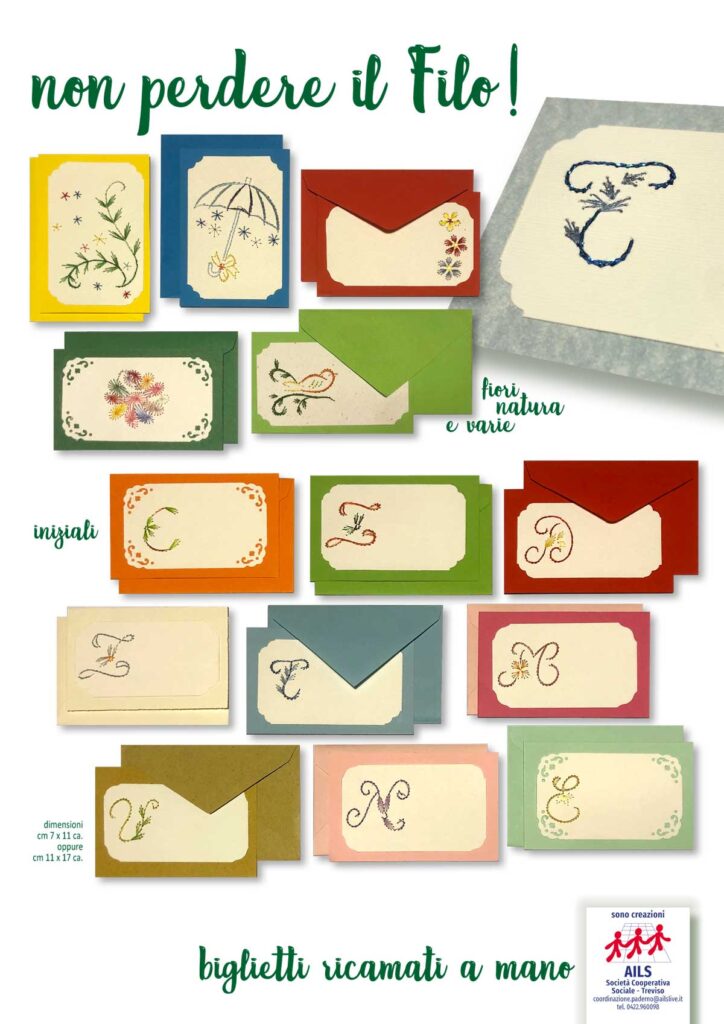 I biglietti che realizziamo all’AILS sono tutti ricamati a mano e disponibili in vari formati e colori. Vengono forniti assieme alle relative bustine che li contengono. Guarda qui sotto la gallery dove puoi vedere all’opera le nostre persone con disabilità, scoprire alcune delle nostre realizzazioni e… se ti piacciono puoi richiedere i nostri biglietti chiamando il n. 0422.960098.