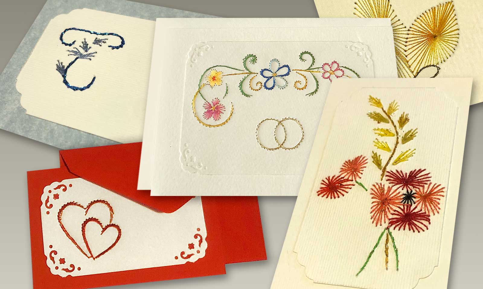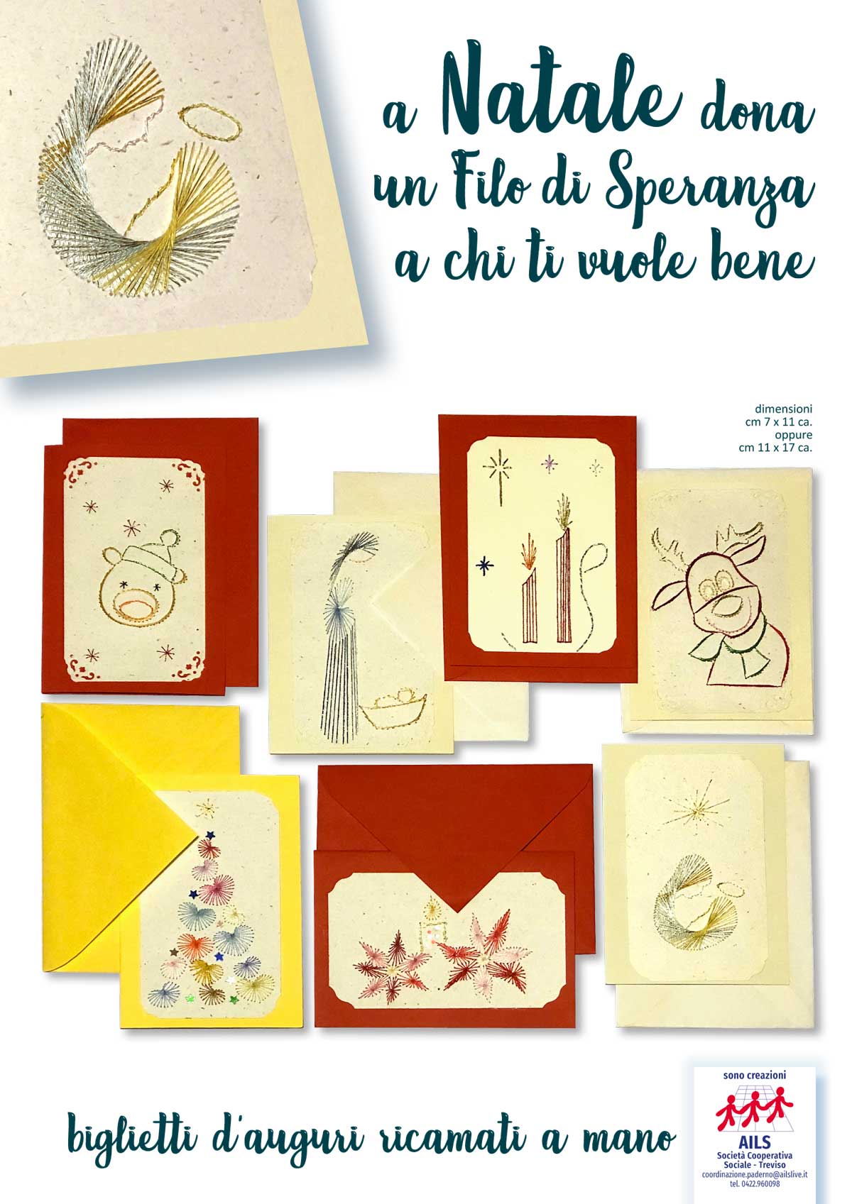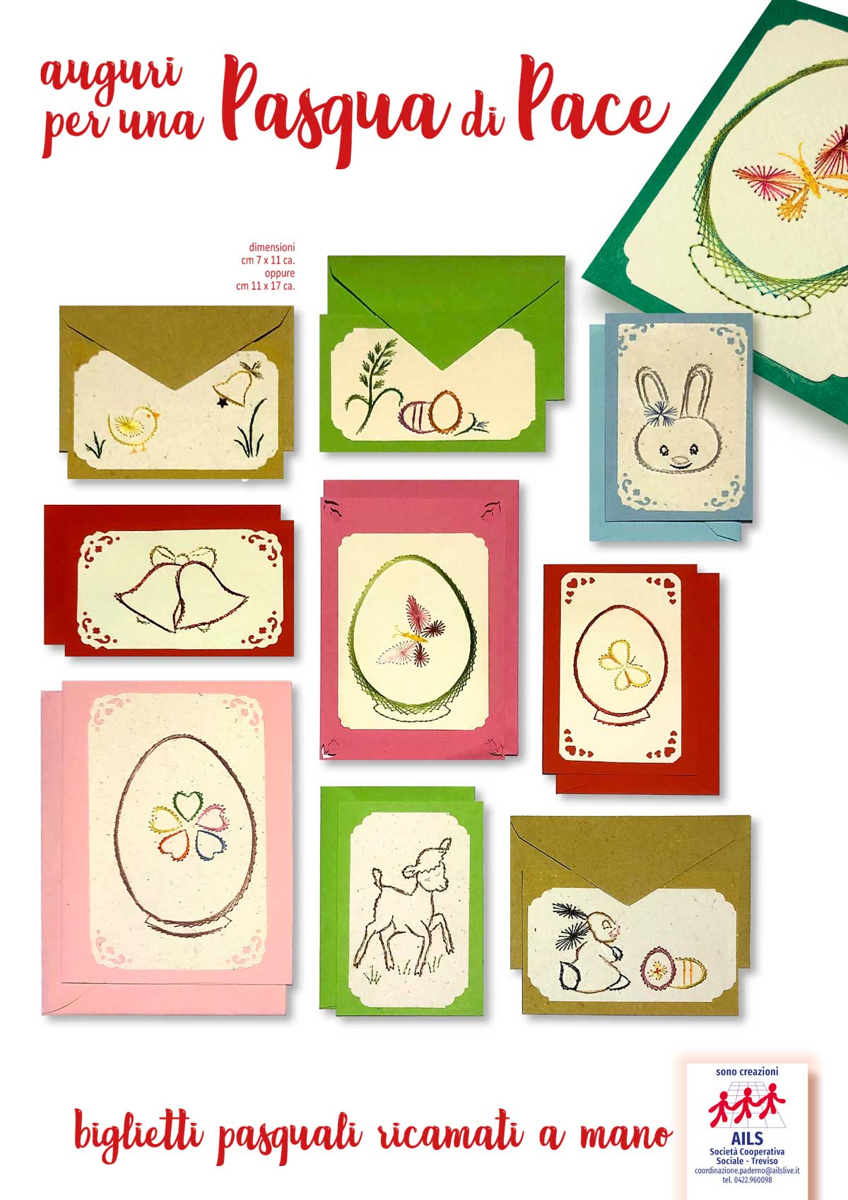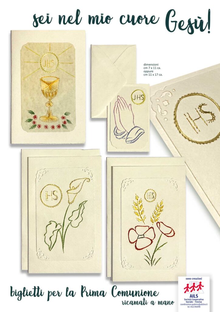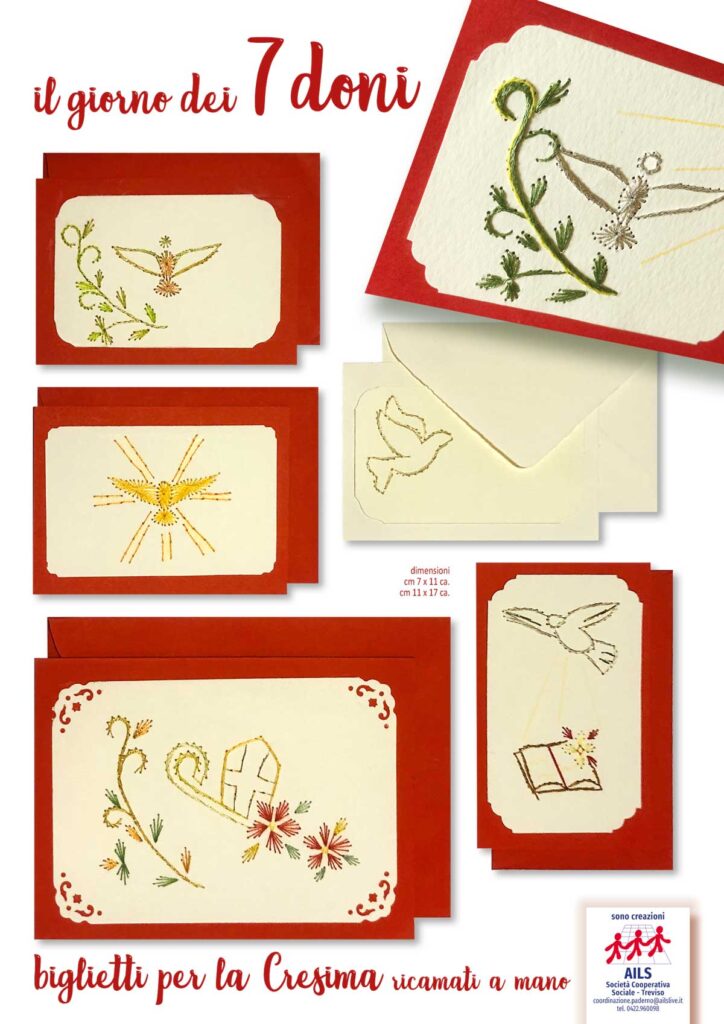 I biglietti che realizziamo all’AILS sono tutti ricamati a mano e disponibili in vari formati e colori. Vengono forniti assieme alle relative bustine che li contengono. Guarda qui sotto la gallery dove puoi vedere all’opera le nostre persone con disabilità, scoprire alcune delle nostre realizzazioni e… se ti piacciono puoi richiedere i nostri biglietti chiamando il n. 0422.960098.