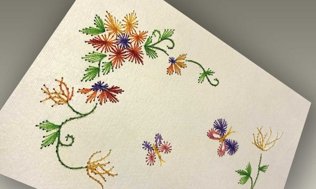 Come vengono realizzati? Su un cartoncino di color panna viene preparata la decorazione che si vuole ottenere, ogni tratto del disegno viene trasformata in una linea di piccoli forellini che i nostri utenti usano pazientemente come traccia da cucire con ago e fili di svariati colori. Il cartoncino completamente decorato può venir applicato sopra un cartoncino di altro colore.